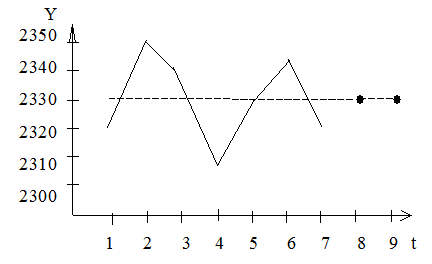 Экстраполяция по среднему уровню ряда динамики Пример. Если ряд, характеризующий реализацию запасных деталей для сельхозтехники не имеет достаточно выраженной тенденции, т.е. его уровни колеблются около средней величины, то прогноз с упреждением на 1-2 уровня будет равен этой средней.