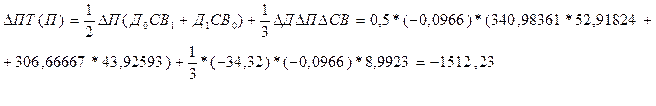 Методом цепных подстановок рассчитаем влияние факторов на производительность труда: Подстановки: ПТ0 = Д0* П0*СВ0 = 340,9836*7,0096*43,926 = 104990,11 ПТ/ = Д1* П0*СВ0 = 306,667*7,0096*43,926 = 94423,90 ПТ// = Д1* П1*СВ0 = 306,667*6,913*43,926 = 93122,64 ПТ1= Д1* П1*СВ1 = 306,667*6,913*52,918 = 112185,58 Изменение производительности труда за счет: - количества отработанных дней: