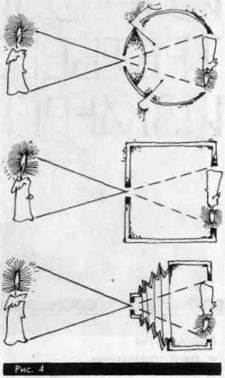 от объекта, проходит в камеру только прямолинейно. Лучи встречаются в отверстии и потом расходятся к задней стенке ящика, на которой появляется перевернутое и уменьшенное изображение объекта, находящегося перед наблюдателем. Собственно говоря, это и был предок современных фото- и кинокамер. Человеческий глаз, камера-обскура, фото- и киноаппараты имеют одинаковую схему строения: точка зрения находится на расстоянии от изображаемого предмета и проек-тирующие лучи сходятся в ней как в центре. Это и есть перспективная или центральная проекция (рис. 4). «Перспектива (от лат. «perspective») — увиденный сквозь что-либо, ясно увиденный — один из способов изображения объемных тел на плоскости или на другой поверхности в соответствии с кажущимися изменениями их величины, формы и четкости, вызванными расположением в пространстве и степенью удаленности от наблюдателя. Пример перспективы дает фотография». Так сказано в Большой советской энциклопедии. И там же можно прочитать: «С помощью композиции определяется положение фигур и предметов в пространстве, для чего в реалистических искусствах используется перспектива». «Перспектива есть руль живописца», — писал Леонардо да Винчи. «Она приносит такую же пользу живописцу, как компас мореплавателю», — говорил немецкий художник Гагедорн. Это понятно, ведь именно передача перспективы дает возможность вос-произвести на плоскости иллюзию окружающего нас материального мира. Кинооператору, в отличие от живописца, не приходится самому со-здавать перспективное изображение. Оно строится оптической системой объектива. Но эти возможности сле-дует использовать творчески. Это один из основных способов форми-