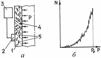 Рис. 4.11. Схема распространения волн 5 акустической эмиссии в стенке 1 резервуара, нагружаемого внутренним давлением (а) и характерная зависимость скорости эмиссии N от давления Р (б): 2 – пьезоэлемент; 3 – акустическая эмиссионная установка; 4 – трещина