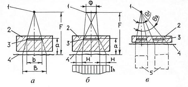 Рис. 5.5. Схемы влияния геометрических условий просвечивания на увеличение (а), резкость (б) и искажение (в) радиационного изображения дефекта 3: 1 – источник излучения; 2 - изделие; 4 – детектор излучения (рентгеновская пленка); 5 – изображение дефекта в плане (I h – интенсивность излучения за изделием)