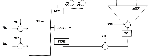 V6 РЧРП:=Чт(РАРП) (выбор второго операнда из РОНов) V9 Р2:=РЧРП (пересылка второго операнда на входной регистр АЛУ) 4 этап. Выполнение операции в АЛУ. V10 РС:=Р1 операция Р2 5 этап. Запись результатов. V5 РАРП:=РК(R1) (адрес 1-го операнда, по которому будет записан результат, подаётся в РАРП) V11 РЧРП:=РС (пересылка результата в регистр РЧРП) V12 Зп(РАРП):=РЧРП (запись результата в R1)