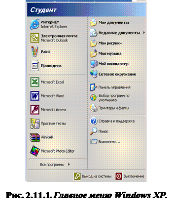 В Windows XP Главное меню имеет новый дизайн (в отличие от других версий). Оно состоит из двух колонок (см. рис. 2.11.1). В левой колонке над разделителем находятся постоянные ссылки на программы (такие как Интернет (Internet Explorer) и Электронная почта (Outlook Express)). Под разделителем находятся ссылки на наиболее часто запускаемые программы (их число можно настроить). В правой колонке расположены команды доступа к основным папкам и функциям настройки системы. Каждый пункт Главного меню содержит свой значок и имя. Некоторые пункты меню сопровождаются стрелкой, указывающей на наличие подменю. Чтобы выполнить команду меню необходимо щелкнуть по ней мышью или нажать клавишу Enter, предварительно выделив мышью нужный пункт. Главное меню Windows XP содержит следующий набор команд: Все программы открывает доступ к программам и группам приложений, установленным на компьютере, в том числе стандартным и служебным; Недавние документы выводит список последних документов, которые открывал пользователь; Панель управления открывает доступ к командам запуска утилит управления составом аппаратных или программных средств и модификации установок операционной среды; Справка и поддержка открывает список всех разделов справочной системы Windows XP, позволяет получить справку по параметру поиска; Поиск открывает Помощника по поиску файлов, папок, принтеров, людей и других компьютеров в сети; Выполнить позволяет запустить любую программу; Выход из системы позволяет закрыть программы и завершить сеанс или оставить программы работающими и переключиться на другого пользователя; Выключение позволяет выключить, перезагрузить компьютер или перейти в ждущий («спящий») режим. Также через Главное меню можно открыть папки Мои документы, Мои рисунки, Моя музыка, Мой компьютер (для просмотра файловой структуры компьютера и сетевых ресурсов), Сетевое окружение (для просмотра сетевых ресурсов локальной сети).