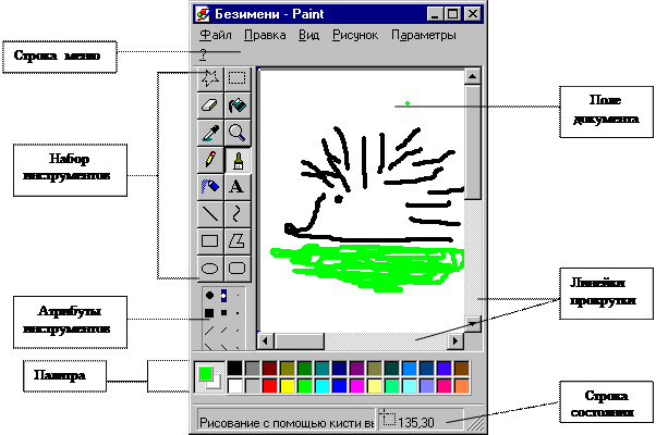 Окно этого редактора содержит следующие элементы (см. Рис. 5.6.1. 1): Набор инструментов - это размещенная по вертикали в левой части окна панель с кнопками для выбора инструментов Paint. Для установки свойств инструментов служит небольшая панель, называемая Атрибуты инструментов, находящаяся под набором инструментов. Выбор конкретного инструмента осуществляется щелчком мыши на соответствующей кнопке. При этом указатель мыши принимает форму характерную именно для этого инструмента. Выбор атрибута инструмента осуществляется щелчком мыши по необходимому атрибуту. Строка состояния – на ней выводится краткая справка о назначении применяемого инструмента.