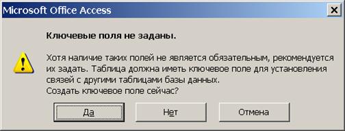 В появившемся окне наберите имя таблицы Список и щелкните по кнопке ОК. Появится запрос (рис. 6) на создание ключевого поля – уникального поля записи, по которому удобно связывать таблицы. В данном варианте будут самостоятельно появляться числа – номера записей. Рис. 6. Окно выбора · Ответьте ДА. · Перейдите в режим Таблицы, щелкнув по кнопке · Заполните базу данных значениями из табл. 5. Таблица 5