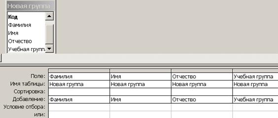 Рис. 37. Условие отбора · Щелкните по кнопке · Подтвердите обновление записей. Если вы сейчас перейдете в режим Таблицы, то, естественно, не увидите ни одной записи, так как цифры 3 заменились на слово Лицей, а условие - на выбор школы 3 не дает ни одной записи. Удалив в строке Условие отбора цифру 3, увидите в режиме Таблицы результат замены. · Закройте запрос, сохранив его с именем Лицей. · Выберите вкладку Таблицы. · Откройте таблицу Список. Просмотрите результат применения запроса. Самостоятельное задание. Создайте запрос Гимназия, меняющий значения поля школа 5 на слово Гимназия (по аналогии с запросом Лицей). Задание 3. Постройте запрос на добавление. Примечание. Записи из таблицы Новая группа нужно добавить в таблицу Список. При возникновении трудностей задания 3 и 4 можно не выполнять. Порядок работы: · Выберите закладку Запрос, если находитесь в другом окне. · Щелкните мышкой по кнопке Создать. · В появившемся диалоговом окне выберите режим Конструктор, щелкните по кнопке ОК. · Добавьте таблицу Новая группа, выбрав ее и щелкнув по кнопке Добавить. · Закончите выбор, щелкнув по кнопке Закрыть. · Выберите те поля, которые нужно добавить (Фамилия, Имя, Отчество, Учебная группа) согласно рис. 38. (Если у какого-либо поля поставить условие отбора, то добавятся только записи, удовлетворяющие этому условию). · Щелкните по стрелке рядом с кнопкой Тип запросана панели инструментов и выполните команду Добавление. · В появившемся диалоговом окне выберите имя таблицы Список, в которую будут добавляться данные. Эта таблица может быть из текущей базы данных или из любой другой. В данном случае у нас одна база данных, поэтому щелкните по кнопке ОК. · Щелкните по кнопке