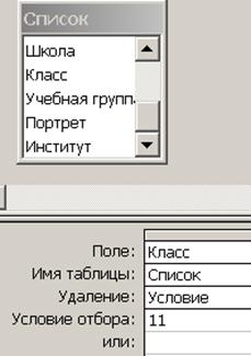 Введите условие отбора 11 (рис. 39). Рис. 39. Ввод условия отбора в поле Класс из таблицы Список