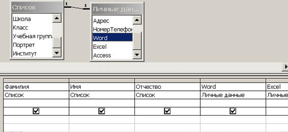 · Щелкните по кнопке · Закройте запрос, сохранив его с именем Удаление. · Перейдите на закладку Таблицы. Откройте таблицу Список и убедитесь, что данные записи были удалены. Самостоятельное задание. Создайте запросы на обновление с именами 10_класс, 9_класс, которые меняют класс на единицу больше (10 на 11, 9 на 10). Заполните недостающие данные для добавленных записей, указав для них класс 9. Задание 5. Выполните запрос на создание таблицы. Бывают ситуации, когда из старых таблиц нужно составить новые с другим набором полей. Предположим, что мы хотим создать таблицы успеваемости для учеников разных групп, поместив поля Фамилия, Имя, Отчество из таблицы Список и поля Word, Excel и Access - из таблицы Личные данные. (Снова создайте связь Список - Личные данные). Порядок работы: · Выберите закладку Запрос, если находитесь в другом окне. · Щелкните мышкой по кнопке Создать. · Впоявившемся диалоговом окне выберите режим Конструктор, щелкнув по кнопке ОК. · Добавьте таблицы Список и Личные данные, выбрав их и щелкнув по кнопке Добавить. · Закончите выбор, щелкнув по кнопке Закрыть. · Щелкните по стрелке рядом с кнопкой Тип запросана панели инструментов и выполните команду Создание таблицы.... · Напечатайте имя таблицы Успеваемость и щелкните по кнопке ОК. · Рис. 40. Выбор полей из таблиц Список и Личные данные · Щелкните по кнопке · Перейдите на закладку Таблицы. Откройте таблицу Успеваемость и убедитесь, что записи были добавлены. Причем добавлено только 10 записей, так как в таблицу Личные данные дополнительные записи не вошли. Задание 6. Создайте перекрестный запрос. Допустим, вам нужно подсчитать для экзаменационной ведомости, сколько в группе, занимающейся изучением программы Word, получено «троек», «четверок» и «пятерок». Для подобных целей используется перекрестный запрос. Порядок работы: · Выберите закладку Запрос, если находитесь в другом окне. · Щелкните мышкой по кнопке Создать. · В появившемся диалоговом окне выберите Перекрестный запрос, щелкнув по кнопке ОК. · В окне Создание перекрестных таблиц выделите таблицу Успеваемость и щелкните по кнопке Далее. · Выберите поле, значения которого будут использоваться в качестве заголовков строк, - Учебная группа. Щелкните по кнопке Далее. · Выберите поле, значения которого будут использоваться в качестве заголовков столбцов, например Word. Щелкните по кнопке Далее. · Выберите функцию, по которой будут вычисляться значения ячеек на пересечении столбцов и строк (в данном случае число). Здесь вы можете добавить итоговое поле для каждой строки (в данном случае это поле покажет общее количество оценок по каждой группе). Щелкните по кнопке Далее. · Задайте имя запроса Word. Щелкните по кнопке Готово. Самостоятельное задание. Составьте аналогичные запросы для оценок, полученных группой по изучению Excel и Access. Предъявите преподавателю: запросы Лицей, Гимназия, Добавление, 10_класс, 9_класс, Удаление, Новая таблица и Word на экране дисплея. Задание 7. Завершите работу с Access. Порядок работы: · Выполните команду Файл - Выход. · Если вы производили редактирование в базе данных, появится вопрос о сохранении изменений. Ответьте на него утвердительно.