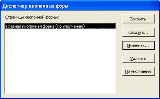 Рис. 52. Окно Диспетчер кнопочных форм · Щелкните в окне Диспетчер кнопочных форм кнопку Изменить, а в открывшемся диалоговом окне Изменение страницы кнопочной формы - кнопку Создать. Появится диалоговое окно Изменение элемента кнопочной формы. · Измените содержимое полей Текст, Команда и Форма в соответствии с рис. 53 (Команду и Форму выберите из списка, а не набирайте вручную).