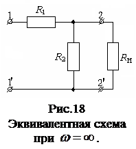 Далее, в соответствии с заданием, необходимо построить график АЧХ. Для этого следует задавать значения частоты и находить значения АЧХ. Полезно предварительно знать в каких пределах изменяется АЧХ при изменении частоты от нулевого значения до бесконечности. Это поможет определить интервал задаваемых значений частот. Определение значения АЧХ на граничных частотах можно двумя способами. Один из них состоит в том, что исходная схема заменяется эквивалентной схемой для нулевой частоты и для частоты равной бесконечности. Так как на нулевой частоте сопротивление катушки равно нулю, а сопротивление конденсатора равно бесконечности, то в схеме в место катушки будет перемычка, а в место конденсатора разрыв. В этом случае исходная схема принимает вид, как это показано на рис.17.