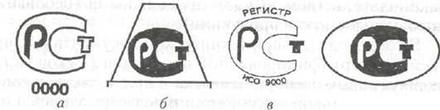 а — знак соответствия при обязательной сертификации; б — знак соответствия «Системы добровольной сертификации»; Госстандарта России; в — знак соответствия системы менеджмента качества; г — знак соответствия требованиям национального стандарта Российской Федерации Рисунок 1 - Знаки соответствия в системе сертификации ГОСТ Р