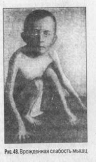 повышенной проницаемостью происходит «утечка» в кровь различных веществ из мышц (аминокислот, углеводов, креатина, ферментов и др.). При миопатии отмечены изменения со стороны симпатической нервной системы и эндокринной системы. Прогрессирующее течение болезни приводит постепенно к полной инвалидизации больного. Описаны случаи, когда болезнь на годы приостанавливается, а потом в результате перенесенных инфекций, а иногда и без видимых причин снова прогрессирует. Педагогические мероприятия. Большое значение приобретают педагогические мероприятия с такими детьми, которые в ряде случаев ограничены в движениях, а иногда вынуждены лежать в постели, не имея возможности общаться с детским коллективом. Естественно, что круг интересов у них сужен, характер меняется, появляются угрюмость, недоверчивость, депрессия, капризность. В этих случаях необходима организация индивидуальных занятий. Педагогу следует помимо формирования знаний и навыков по отдельным предметам программы уделять большое внимание психотерапии, поднимая психический тонус больного ребенка. Миатония — синдром врожденной генерализованной гипотонии или атонии мышц. Болезнь впервые описана немецким ученым Г. Оппенгеймом. Выражается в снижении мышечного тонуса, что бывает заметно уже в первые дни жизни ребенка. В этих случаях отсутствуют те движения, которые свойственны новорожденным. Дети лежат неподвижно в кроватке, не поднимая рук и ног. Если мышцы поражаются не полностью, то движения детей бывают медленными, вялыми. Снижение мышечного тонуса сильнее выражено в ногах (рис. 48), затем в туловище, руках и мышцах шеи.