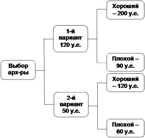Группа разработчиков должна создать ИС. Существует 2 варианта: - разработать систему с нуля. Стоимость системы 120 у.е.; - создавать ее на основе существующей платформы. Стоимость 50 у.е. Вероятность хорошего спроса любой информационной системы – 65%. Слабый спрос – 35%. При хорошем спросе на 1-й вариант ИС доход – 200 у.е., при слабом – 90 у.е.