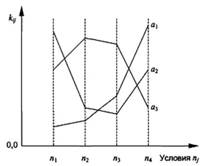 Рис. 2.11. Диаграмма эффективности систем аi для условий nj В неопределенной операции могут быть известны множество состояний обстановки и эффективность систем для каждой из них, но нет данных, с какой вероятностью может появиться то или иное состояние. В зависимости от характера неопределенности операции могут делиться на игровые и статистически неопределенные. В игровых операциях неопределенность вносит своими сознательными действиями противник. Для исследования игровых операций используется теория игр. Условия статистически неопределенных операций зависят от объективной действительности, называемой природой. Природа рассматривается как незаинтересованная, безразличная к операции сторона (она пассивна по отношению к лицу, принимающему решение). Такие операции могут исследоваться с применением теории статистических решений. Если операция, проводимая системой, уникальна, то для разрешения неопределенности при оценке систем используются субъективные предпочтения ЛПР. По этой причине единого критерия оценки эффективности для неопределенных операций не существует. Разработаны лишь общие требования к критериям и процедурам оценки и выбора оптимальных систем. Основными требованиями являются: · оптимальное решение не должно меняться с перестановкой строк и столбцов матрицы эффективности; · оптимальное решение не должно меняться при добавлении тождественной строки или тождественного столбца к матрице эффективности; · оптимальное решение не должно меняться от добавления постоянного числа к значению каждого элемента матрицы эффективности; · оптимальное решение не должно становиться неоптимальным, а неоптимальное оптимальным в случае добавления новых систем, среди которых нет ни одной более эффективной системы; · если системы ai и aj оптимальны, то вероятностная смесь этих систем тоже должна быть оптимальна. В зависимости от характера предпочтений ЛПР наиболее часто в неопределенных операциях используются критерии: • среднего выигрыша; • Лапласа; • осторожного наблюдателя (Вальда); • максимакса; • пессимизма-оптимизма (Гурвица); • минимального риска (Сэвиджа). Рассмотрим эти критерии на примере. Пример 2.2. Необходимо оценить один из трех разрабатываемых программных продуктов ai для борьбы с одним из четырех типов программных воздействий Kj. Матрица эффективности представлена в табл. 2.11.