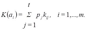 Здесь ai ‒ i-й программный продукт, i = {1, 2, 3}; kj ‒ оценка эффективности применения i-го программного продукта при j-м программном воздействии {j} Критерий среднего выигрыша. Данный критерий предполагает задание вероятностей состояний обстановки рi Эффективность систем оценивается как среднее ожидаемое значение (математическое ожидание) оценок эффективности по всем состояниям обстановки:
