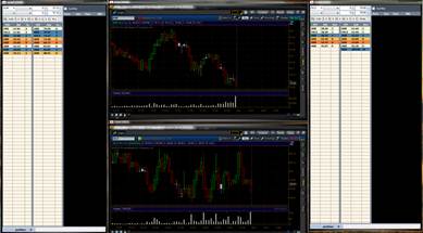 9 мониторов, главный первый, расположение: 1 – рабочие иконки windows, график SPY 5 мин + 1 мин 2 – 7 вотчилистов (up – текущие акции смотрим наверх, down – текущие акции смотрим вниз, td – акции выбранные до открытия, v4 – интересные акции за вчерашний день, listup – лист со всеми акциями с фильтрами роста, listdown - лист со всеми акциями с фильтрами падения), часы, главное окно Арче, Orderlist – open orders, Orderlist – Executions, Positions 3 – два минутных графика + level2 для торгуемых стаков 4 – 8 5-минутных графиков для наблюдения падающих стаков 5 – графики денвки и пятиминутки основного просматриваемого стака 6 – минутка и level2 просматриваемого стака 7 - 8 5-минутных графиков для наблюдения растущих стаков 8 – окно трансляции 9 – чат трансляции, чаты скайпа, основное окно скайпа, таймер обратного отсчета для паузы после отрицательных сделок, таймер подсчета рабочего времени, виджет часов stocktime Все графики и вотчлисты thinkorswim, фильтры на вотчлистах На столе шахматные пешки для подсчета отрицательных сделок + распечатки правил и напоминаний