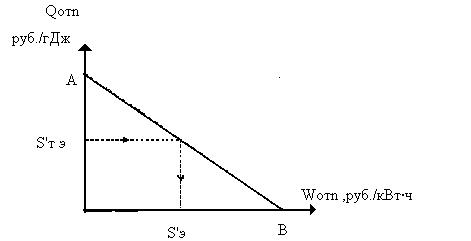 Рис. 4.1. Определение себестоимости электрической и тепловой энергии по методу Гинтера: S'T э– себестоимость производства единицы тепла в котельной; S'э– себестоимость единицы электроэнергии; Qотn – количество тепловой энергии, отпускаемой на сторону, ГДж; Wотn – количество электрической энергии, отпускаемой на сторону, кВт·ч.