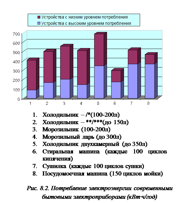 Уделим внимание практическим приемам правильного пользования электробытовыми приборами для повышения их энергетической эффективности. При приготовлении пищи или кипячении воды целесообразно выключать конфорки несколько раньше окончательной готовности или закипания воды, это позволяет сэкономить до 20% электроэнергии за счет тепловой инерции раскаленной конфорки. Более экономично пользоваться электрочайниками, электрокофеварками, яйцеварками, печами СВЧ и т.п., которые имеют КПД в 1,5–1,8 раза выше, чем обычные газовые и электрические плиты. При приготовлении нескольких блюд можно сберечь от 10 до 30% электроэнергии, если использовать еще не остывшие конфорки для предварительного нагрева воды, используемой в приготовляемых блюдах, если пользоваться предварительно отстоявшейся водой комнатной температуры, а не холодной (8–10°С) прямо из-под крана, если во время готовки накрывать кастрюлю крышкой. Все крупы имеет смысл замачивать с вечера, залив горячей водой, накрыв плотно крышкой, – это также сэкономит расход энергии на приготовление. Добиться значительной экономии электроэнергии можно при разумном сочетании общего и локального (местного) освещения на рабочем столе, в гостиной для просмотра телевизионных программ, у зеркала в прихожей и т.п. Хорошо предусмотреть возможность включения части ламп в светильниках, автоматического отключения освещения при выходе из комнаты, использовать современные энергосберегающие лампы. К ним относятся, например, компактные люминесцентные лампы КЛЛ, которые потребляют в 6–7 раз меньше электрической энергии по сравнению с лампами накаливания при одинаковой освещенности. Для любых типов ламп светоотдача увеличивается с увеличением мощности. Использование нескольких ламп малой мощности вместо одной мощной лампы в осветительных устройствах требует больше энергии. Так, 4 люминесцентных лампы по 20 Вт дают 2/3 света, который можно получить от двух ламп по 40 Вт, или 4/7 света, который дает одна лампа 75 Вт. Действенным инструментом стимулирования экономии энергоресурсов в жилом секторе послужило Постановление Совета Министров от 7 июля 1994 г. «О введении приборного учета расхода газа, воды и тепловой энергии в домах жилищного фонда республики», которое обязало оснащать вновь вводимое и капитально ремонтируемое жилье приборами группового и индивидуального учета. Счетчик оказывает психологическое действие: когда платишь за реально потребленное количество воды, газа, тепла, осознаешь, что оно могло бы быть меньшим, и думаешь о возможностях экономии. К мощным организационно-экономическим инструментам повышения энергоэффективности бытовых приборов и устройств относится их маркировка по уровню удельного энергопотребления. Цена на товары назначается в зависимости от маркировки и регулирует поведение производителя и потребителя на рынке: стимулирует производителя на выпуск более энергоэкономичного оборудования, а потребителя – на его приобретение. Кроме того, маркировка энергоэффективности позволяет населению ориентироваться в широкой номенклатуре бытовой техники.