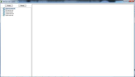 При запуске программы открывается программа Delphi последней версии, и не обязательно последней, в котором находятся 2 фрейма (Рис.1). Левый фрейм содержится из разделов, тем и тестов, на правом фрейме будут показываться содержания этих разделов, тем и тестов, а верхний будет показывать наименования электронного пособия.