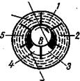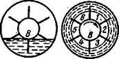 Для заливки центробежных насосов устанавливают особые вакуум-насосы. В практике насосных станций широко применяют водокольцевой насос, известный под названием вакуум-насоса. На рисунке 30 приведена схема, поясняющая его действие. Звездообразное колесо В вращается по оси, которая концентрически расположена в цилиндре, частично заполненном водой. При вращении колеса В образуются концентричное кольцо воды и одинакового размера пространства 1-6 между лопатками (рис.30 б). Если колесо расположить в цилиндре эксцентрично (рис.30 в), то есть так, чтобы водяное кольцо касалось втулки колеса, то пространство между лопатками, начиная от точки касания, будут увеличиваться от 1 до 3, а далее (от 4 до 6) уменьшаться. При этом газ или воздух будут засасываться из всасывающего отверстия и соответственно нагнетаться в нагнетательное отверстие. Общий КПД насоса невелик (от 30 до 20%), но это обычно не имеет существенного значения, так как такой насос при заливке работает периодически и короткое время. Конструкция вакуум-насоса показана на рисунке 30. Насос присоединен к фланцу электродвигателя, на вал которого насажено колесо 1, представляющее собой бронзовый диск с двенадцатью радиальными лопатками 4. Для разгрузки осевых усилий, действующих на вал 10, устроено шесть отверстий 2. Входное отверстие 14 и напорное 13 расположены вверху корпуса. Трубы присоединяются к отверстиям на резьбе или при помощи фланцев 15, закрепляемых шпильками 12. Колесо расположено эксцентрично по отношению к крышке 5. Воздух и вода засасываются через серповидный вырез в корпусе 6, а при сжатии через другой малый серповидный вырез происходит выбрасывание воздуха и излишней воды. Необходимо, чтобы при работе насоса через него непрерывно циркулировала вода для поддержания постоянного объема водяного кольца в насосе, а также для отвода выделяющегося тепла при работе насоса. Особое значение у вакуум-насоса имеет сальник, который должен быть воздухонепроницаемым. Уплотнение сальника состоит из корпуса 7,отлитого за одно целое с корпусом насоса, чугунной крышки 8, мягкой хлопчатобумажной набивки 19 и кольца 3, закрепленного на вал пружинным кольцом 20. Чугунная опорная стойка 17 служит станиной вакуум-насоса, к фланцу которой шпильками присоединен корпус насоса.