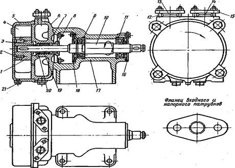 В опорной стойке размещены два шарикоподшипника 9 и 11, служащие опорами для вала 10. Осевая сила воспринимается подшипником 11. Чугунные крышки 16 и 18 фиксируют положение подшипников, смазка которых осуществляется солидолом или техническим вазелином. Перед пуском вакуум-насос заливают водой. По окончании работы из насоса удаляют воду через отверстие, закрытое пробкой 21.