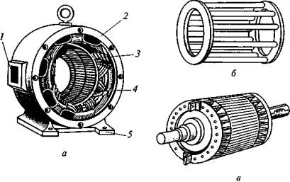 Рисунок 34 - Устройство асинхронного двигателя а - статор; б - короткозамкнутая обмотка ротора (беличья клетка); в - ротор в собранном виде; 1 - клеммный щиток; 2 - станина; 3 - обмотка; 4 - сердечник; 5 - лапа.