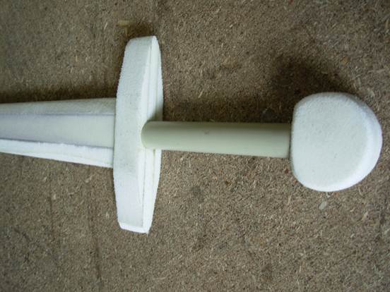 Через несколько часов наш меч полностью готов к покраске латексом. Но перед этим его ОБЯЗАТЕЛЬНО нужно пройти меч строительным феном – если этого не сделать, вся поверхность будет покрыта мерхими заусеницами и внешний вид будет изрядно испорчен. Пройдите феном по всем зашкуренным поверхностям, приглаживая торчащий ворс рукой. ОСТОРОЖНО: 1) Засовывать руку в струю фена нельзя категорически, иначе возможны ожоги. 2) Не передерживайте фен на отдельных участках, особенно на клеевых швах – они могут разойтись. 3) Попробуйте выгладить ворс рукой, после разогрева феном, сначала на каком-нибудь ненужном обрезке. Для начала подготовим место, в котором будет сушиться клинок. Это должно быть хорошо проветриваемое место в тени (ни в коем случае не под прямыми лучами солнца). Желательно подстелить что-нибудь на пол, ибо латекс с некоторых поверхностей (к примеру ковров и ковровых покрытий) отчистить крайне проблематично. Делаем из скотча петлю на рукоять, за которую мы будем подвешивать меч для сушки. Смешиваем половину банки латекса с 15-20 граммами чёрной краски. Вторую половину делим на 2 неравные части, большую из которых в отдельной посуде смешиваем с 10 граммами краски цвета «сталь», а меньшую - с 5 граммами «бронзы». Несколько общих советов по окраске: 1) Не спишите – не пытайтесь залить изделие как можно более толстым слоем. Текущие капли изрядно портят внешний вид и увеличивают расход латекса. 2) Работайте кистью длинными мазками, чтобы свести к минимуму разводы. 3) Не пытайтесь красить поверх не досохший до конца слой. Это чревато полной порчей внешнего вида изделия. Начинаем красить. Сначала наносим 5-6 слоёв латекса с чёрной краской на всё тело меча, включая гарду и яблоко. После каждого слоя тщательно промываем кисть в проточной воде, иначе к следующему слою придется брать новую. Даём каждому слою полностью просохнуть. Признаком полного высыхания слоя является исчезновение белёсых разводов – высохший латекс прозрачный. После высыхание последнего чёрного слоя наносим на клинок один за другим два-три слоя латекса с краской «сталь». При этом стараемся не попадать краской на гарду. После высыхания клинка наносим на гарду и яблоко 2-3 слоя латекса с крской «бронза». Покрываем с помощью новой кисти полностью высохший меч Finish Cover. Покрываем тщательно, стараясь не пропускать даже маленьких участков. Finish Cover увеличивает прочность наружного покрытия меча и предохраняет латекс от потери эластичности. Оставляем меч висеть на некоторое время – от 10-12 часов до несколько суток – в зависомости от разной температуры и влажности Finish Cover нужно различное время, чтобы полностью полимеризоваться.