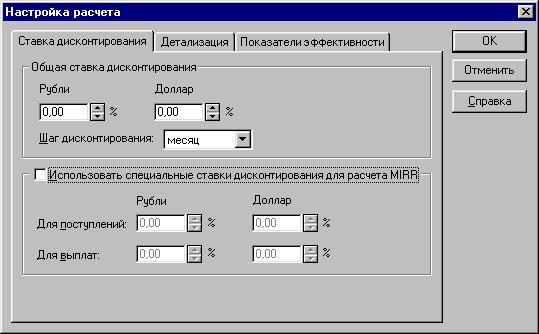 Подраздел "Настройка расчета" предназначен для указания параметров расчета показателей эффективности проекта и степени детализации результатов и включает три закладки: “Ставка дисконтирования”, “Детализация”,”Показатели эффективности”. Закладка “Ставка дисконтирования ” позволяет ввестиставку дисконтирования для любой из валют, которая используется при расчете показателей эффективности инвестиций. Ее величина может быть установлена по процентным ставкам банковских вкладов, государственным ценным бумагам или другим альтернативным возможностям надежного вложения денег. В финансовых отчетах отображаются всегда недисконтированные денежные потоки. Исключение составляет таблица "Кэш-фло", данные в которой могут быть рассчитаны с учетом ставки дисконтирования в зависимости от состояния флажка "Дисконтировать строки при отображении", уставнавливаемом в подразделе "Отображение данных". Величины ставок дисконтирования, установленные в группе полей "Общая ставка дисконтирования" для первой и второй валют проекта, используются при расчете следующих показателей: дисконтированный период окупаемости (DPB), индекс прибыльности (PI), чистый приведенный доход (NPV), длительность проекта (D).