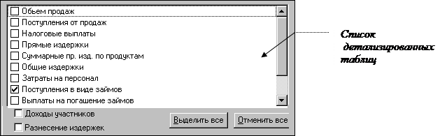 Для расчета модифицированной внутренней нормы рентабельности (MIRR) можно использовать специальные ставки дисконтирования для поступлений и выплат в любой валюте проекта. Закладка “Детализация ” позволяет сформировать отдельные та,лицы с детализированными данными, содержимое которых после расчета проекта можно просмотреть в подразделе “Детализация результатов” раздела “Результаты”. Набор детализированных таблиц расположен в центральной части закладки. Выбор таблицы выполняется установкой флажка слева от ее названия.