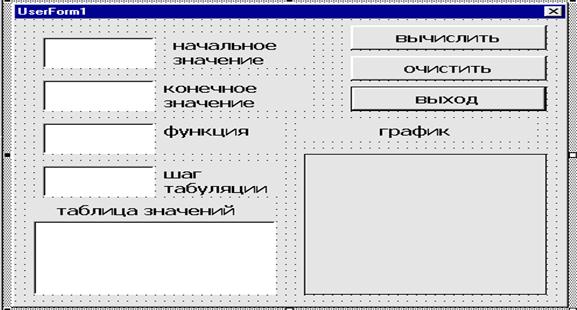 Сконструювати додаток, за допомогою якого можна табулювати значення функції, що вводиться, на заданому інтервалі з заданим кроком і побудувати графік функції в користувальницькій формі такого виду (рис.4):