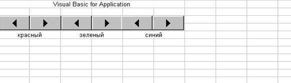 За допомогою цих властивостей лічильника і функції RGB створимо додаток для керування палітрою кольорів тексту «Visual Basic for Application», уведеного в чарунку «А1» робочого листа. Для цього на робочому листі створимо 3 лічильники, за допомогою вікна Properties установимо значення їх властивостей і в модулі робочого листа напишемо відповідні процедури