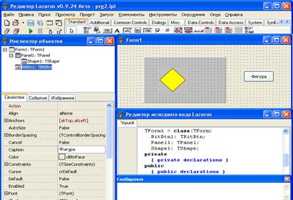 Рис.4. Интерфейс ИСР Lazarus ИСР представляет собой многооконную систему, содержащую главное окно (сверху), дерево объектов, инспектора объектов, конструктор формы, редактор кода. Окна Lazarus можно перемещать, убирать с экрана, а также изменять их размеры обычными приемами Windows. Несмотря на наличие многих окон, Lazarus является однодокументной средой, то есть позволяет работать только с одним приложением (проектом). Название проекта выводится в строке заголовка главного окна. Переключение между окнами приложения осуществляется с помощью мыши, клавиш <F11> или < F12>, а также соответствующих кнопок панели инструментов. Главное окно содержит: - меню с обширным набором команд для доступа к функциям Lazarus; - панель Инструментов с кнопками для вызова часто используемых команд из главного меню; - палитру компонентов. Все компоненты делятся на группы, каждая из которых располагается на отдельной вкладке (странице) палитры. Нужная вкладка выбирается щелчком левой кнопки мыши по ярлычку. ИСР Lazarus позволяет разрабатывать разные программы, называемые проектами. В разработке рассматриваются проекты типов: § Консольное приложение (Custom Program) – под операционную систему DOS с символьным интерфейсом. Оно позволяет использовать маломощные компьютеры, отличается малыми размерами и ограниченными функциональными возможностями. Для его создания используется команда Файл \ Создать \ Project \ Custom Program \ ОК. § Оконное Приложение(Application) – под операционную систему Windows с графическим интерфейсом. Оно позволяет использовать все функциональные возможности операционной системы Windows, требует мощный компьютер и отличается большими размерами исполняемого файла. Для его создания используется команда Файл \ Создать \ Project \ Application \ ОК. Среда создает проект с пустой формой, с помощью которой можно конструировать интерфейс разрабатываемого приложения. Кроме того, вместе с формой среда создает окно редактора кода, которое почти полностью закрыто окном формы. В окне Конструктора формы выполняется проектирование формы, для чего на форму Form1 из Палитры компонентов помещаются необходимые элементы. Окно Редактора кода (Unit1) содержит исходный текст модуля разрабатываемого приложения. Редактор кода позволяет редактировать текст модуля, файл проекта. Каждый редактируемый файл находится в окне редактора на отдельной странице, доступ к которой можно получить, щелкнув по ее ярлычку. При сохранении модуля (оконный вариант проекта) образуются два файла – модуль проекта и описание формы проекта. При сохранении самого проекта образуется еще и файл главного проекта, имя которого должно отличаться от модуля. После компиляции проекта в папке сохранения образуются компилированный файл и пакетный файл ppas.bat. С помощью последнего файла можно создать исполняемый файл с расширением exe. Все файлы проекта размещаются в одной директории (папке). Окно Инспектора объектов отображает свойства и события объектов для текущей формы. Окно имеет две страницы (вкладки): Свойства и События. Страница Свойства отображает информацию о компоненте, выбранной в окне Конструктора формы, и позволяет удобно и просто изменять ее свойства. Страница События определяет процедуру, которую компонента должна выполнить при возникновении соответствующего события. Каждый компонент имеет свой набор свойств и событий, опред