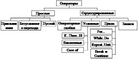 Операторы, это синтаксические конструкции, предназначенные как для записи алгоритмических действий по преобразованию данных, так и для задания порядка выполнения других действий. Набор операторов языка Free Pascal составляет минимальное множество конструкций, необходимых для наглядного и однозначного представления алгоритмов в стиле структурного программирования. Набор операторов языка показан на рис.7. Для первого знакомства с операторами языка достаточно ограничиться основными из них.
