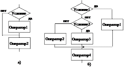 Рис. 7. Классификация видов операторов. 4.5.1. Простые операторы. Простыми называются операторы, которые не содержат в себе других операторов. Оператор присваивания предназначен для вычисления нового значения некоторой переменной или функции. Формат записи оператора присваивания: <имя переменной>: = <выражение>; Например, x:= x+1; color:= red; Присваивания допускаются для всех типов, но тип выражения должен быть совместим с типом переменной. Левая и правая части оператора присваивания совместимы в следующих случаях: типы обеих частей одинаковы; левая часть вещественного типа, правая - целого, но не наоборот; левая часть строкового типа, правая - символьного, но не наоборот. Безусловный переход описывается оператором безусловного перехода goto. Формат оператора: goto <метка>;. Меткой должен быть помечен оператор, на который происходит переход, причём метка и этот оператор разделяются двоеточием, т.е. операторная строка будет иметь вид: <метка>: <оператор, на который происходит переход>;. Все используемые метки должны быть перечислены в разделе описаний после служебного слова label. Одной и той же меткой можно пометить только один оператор. Не рекомендуется делать переходы к операторам, находящимся внутри составных. Это может вызвать непредсказуемую ошибку. Оператор Goto не рекомендуется использовать для досрочного выхода из подпрограммы. Для этого предназначена специальная процедура Exit. Пустой оператор не выполняет никакого действия и никак не отображается в программе. В основном он используется для передачи управления в конец составного оператора. Например: ............; label out; //Объявление метки ... begin //Открывающая операторная скобка ... goto out; //Переход к метке ... out: //Пустая операторная строка end. //Закрывающая операторная скобка 4.5.2.Составной оператор. Составной оператор - это последовательность произвольных операторов программы, заключённая в операторные скобки: begin Отдельные операторы внутри составного оператора ............ отделяются друг от друга точкой с запятой. begin Составной оператор применяется в тех случаях, когда грамматика языка допускает использование только …..... одного оператора, в то время как семантика програм- end; мы требует задания некоторой последовательности ............. операторов. Среди операторов составного оператора end. могут быть и другие составные операторы. В этом случае после end также ставиться точка с запятой. Оператор условного перехода в общем случае состоит из трёх служебных слов: if (если), then (то), else (иначе). Полный формат условного оператора имеет вид: if <условие> then <оператор 1> else <оператор 2>; Вторая часть оператора, начиная со слова else, необязательна, но в такой полной форме оператор очень хорошо описывает базовую структуру "ветвление" (рис. 2 б). Действительно, служебное слово then отображает ветвь "да", а else - ветвь "нет". В качестве операторов 1 и 2 может быть любой, но только один, оператор языка. В качестве условия может быть как простое отношение, например, X>0, так и выражение, например, X + 2*Z >0. На рис.8,а показана алгоритмическая структура, допускающая укороченную форму записи условного оператора: if <условие> then <оператор 1>; <оператор 2>; Условный оператор, называется вложенным, если в один условный оператор вкладывается другой. Степень вложенности может быть произвольной. На рис.8,б показан вариант алгоритмической структуры, обуславливаю