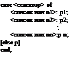 Примеры записи условия: 1) if (x<=b) and (x>=a) then <выражение C1> else <выражение C2>; или 2) if (x<a) or (x>b) then <выражение C2> else <выражение C1>; Примечание: скобки необходимы, поскольку логические операции "старше" операций сравнения. После записи условного оператора обязательно его тестирование. Используя алгоритм выполнения этого оператора компилятором, необходимо проанализировать все пути ветвлений, что поможет найти и устранить ошибки до выполнения программы, а, следовательно, существенно сократить время отладки программы. Оператор выбора варианта Case … of является обобщением условного оператора для случая произвольного числа альтернатив. При его использовании различным значениям некоторого выражения сопоставляются соответствующие им операторы. В формате записи оператора варианта селектор - переменная порядкового типа; n1, n2,..nn – одиночные константы, p1,.. pn – операторы; в списке перечисляемые константы разделяются запятыми, например: 1,3,7 или ’A’..’Z’. Все константы списка должны быть разными и иметь порядковый тип, совместимый с типом селектора.