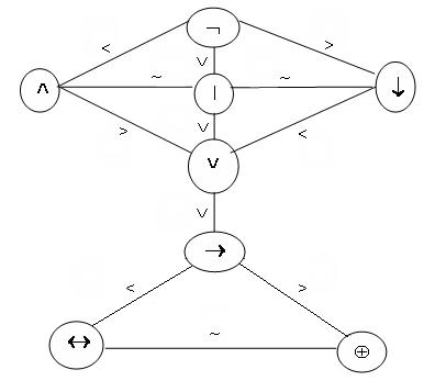При тождественных преобразованиях, при составлении формул важно знать приоритеты операций (какая сильнее, какая слабее), как раскрывать скобки. Для этих целей приняты следующие соглашения: а) внешние скобки не пишутся, например, вместо б) на множестве «>» - быть более сильным и отношение «~» - быть равносильным, по правилам, указанным на схеме: