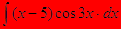 В) интегрирование по частям ∫udv=uv-∫vdu ∫(x-5)cos3x∙dx=1/3(x-5)sinx-∫1/3sinx∙dx=[ Примечание: U=x-5; du=dx; dv=cos3x∙dx; v=∫cos3x∙dx=1/3sinx ]= =1/3∙ [(x-5) ∙sinx+cosx]+C