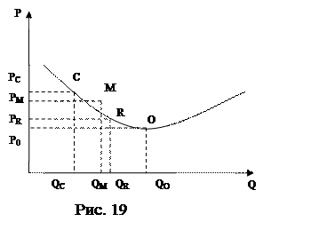 Оптимальным будет объем выпуска Q0, уровень издержек – P0, но фирма, стремясь максимизировать прибыль, ограничит объем производства до уровня Qm. При этом в силу Х-неэффективности издержки фирмы будут лежать не на кривой, а выше (в точке М). Такая ситуация далека от оптимальной и требует государственного вмешательства. Если государство попытается решить эту проблему путем принудительного раздробления монополиста на множество мелких фирм, то объем производства снизится до Qc, а издержки повысятся (Pc), так как малое производство в потенциально монополистических отраслях крайне неэффективно. Поэтому целью антимонопольной политики является не столько борьба с монополистами как таковыми, сколько борьба с избыточным, чрезмерным монополизмом и ограничение монополистических злоупотреблений. Желаемый результат антимонопольной политики соответствует QR (при PR). В экономической литературе существуют различные подходы к характеристике направлений антимонопольной политики. Так, П. Самуэльсон и В. Нордхаус применительно к США выделяют следующие пять направлений вмешательства государства в деятельность монополий. Во-первых, их прибыли сокращаются за счет высоких налогов. Во-вторых, устанавливается контроль над ценами (для сдерживания инфляции и давления на цены в высококонцентрированных отраслях). В-третьих, устанавливается государственная собственность на монополии. В-четвертых, осуществляется государственное регулирование промышленности, которое позволяет государственным органам наблюдать за ценами, объемами производства, входом и выходом фирм из отраслей. В-пятых, государство проводит специальную антитрестовскую политику. Можно выделить три принципиальных возможности понижения степени монополизации: 1. Прямое разделение монопольных структур. 2. Иностранная конкуренция. 3. Создание новых предприятий. Как уже отмечалось, возможности первого пути весьма ограничены. Но если на Западе демонополизация предприятий-гигантов возможна путем разделения их на части, так как они формировались при объединении и поглощении независимых фирм. Последние могут быть восстановлены в качестве самостоятельных компаний. Российские монополисты, напротив, сразу создавались как единый завод или технологический комплекс, который принципиально не может быть разделен на отдельные части без полного разрушения. Ещё одна специфическая российская разновидность монополизма состоит в диктате ведомств и госорганов, продолжающих и в наше время активно вмешиваться в деятельность некоторых предприятий. Формально-юридических прав на это они не имеют – предприятия находятся в частной собственности. Но реальные рычаги давления у органов власти есть, например не пустить в отрасль стороннего производителя с помощью частокола инструкций и распоряжений они вполне могут. Второй путь – иностранная конкуренция – явился, вероятно, самым действенным и эффективным ударом по отечественному монополизму. Когда рядом с изделием монополиста на рынке находится превосходящий его по качеству и сопоставимый по цене импортный аналог, все монополистические злоупотребления становятся невозможными. Монополисту приходится думать о том, как бы вообще не оказаться вытесненным с рынка. Но непродуманная таможенная и валютная политика может иметь негативные последс