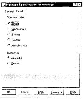 Задать синхронизацию сообщения можно следующим образом: · Дважды щелкните на сообщении на диаграмме Последовательности или Кооперативной диаграмме. · В окне спецификации сообщения перейдите на вкладку Detail (Подробно). Установите переключатель Synchronization в нужное значение.