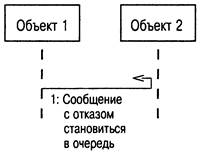 Balking (С отказом становиться в очередь) Клиент посылает сообщение серверу. Если сервер не может немедленно принять сообщение, оно отменяется. На диаграммах Последовательности и Кооперативных диаграммах такие сообщения показывают следующим образом:
