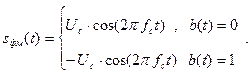 В модуляторе случайная синхронная двоичная последовательность биполярных импульсов b(t) осуществляет манипуляцию гармонического сигнала-переносчика U(t)=Uсcos2pfсt, где Uс = 1В. Несущая частота высокочастотного радиосигнала должна многократно превышать частоту следования импульсов и fс = 100VK = 12,8 МГц. Для фазовой модуляции символ «0» будет отображаться в сигнале-переносчике вида s0(t) =Uсcos2pfсt, а символ «1» – в сигнале-переносчике вида s1(t)= -Uсcos2pfсt.