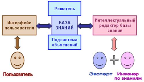 Рис. 7.2. Обобщенная структура экспертной системы Определение и взаимодействие компонентов ЭС и людей, имеющих к ней непосредственное отношение, может быть описано следующим образом. Эксперт – это специалист предметной области, способный принимать экспертные решения и формулирующий знания о предметной области для ввода их в базу знаний. Инженер по знаниям (инженер-аналитик, инженер-когнитолог) – это специалист в области искусственного интеллекта, отвечающий за структуру и наполнение базы знаний. Пользователь – это также специалист в данной предметной области, но его квалификация недостаточно высока, и поэтому он нуждается в помощи и поддержке своей деятельности со стороны ЭС. База знаний – это совокупность знаний о предметной области, организованных в соответствии с принятой моделью представления знаний. Решатель или подсистема логического вывода (интерпретатор, машина вывода, дедуктивная машина, блок логического вывода) – это программа, моделирующая ход рассуждений эксперта на основании знаний, имеющихся в базе знаний. Решатель формирует последовательность правил, которая приводит к решению задачи, используя исходные данные из рабочей памяти и базы знаний. Различают прямую и обратную цепочку рассуждений. Прямая цепочка рассуждений ведет от данных к гипотезам, обратная – является попыткой найти данные для доказательства или опровержения некоторой гипотезы. Редактор базы знаний – это программа, предназначенная для ввода в базу знаний новых знаний о предметной области и их представления в ней. Подсистема объяснений – это программа, которая позволяет пользователю получить ответы на вопросы: «Как была получена та или иная рекомендация?», «Почему система приняла такое решение?» и др. Это повышает доверие пользователя к полученному результату. Взаимодействие пользователя с ЭС осуществляется через интерфейс пользователя на близком к естественному или профессиональному языку предметной области непроцедурном языке. Интерфейс пользователя – это комплекс программно-технических средств, обеспечивающих взаимодействие пользователя с ЭС как на стадии ввода информации, так и при получении результатов (в процессе приобретения знаний и объяснения результатов работы). Это взаимодействие обычно включает несколько функций: 1. Обработка данных, полученных с клавиатуры или других устройств ввода и отображение вводимых и выводимых данных на мониторе. 2. Поддержка диалога между пользователем и системой. Диалог – это общая форма консультации с экспертной системой. Консультация должна завершаться ясным утверждением, выдаваемым системой, и объяснением последовательности вывода, приведшей к этому утверждению. 3. Распознавание ситуации непонимания между пользователем и системой. Система должна реагировать соответствующим образом на эту ситуацию. Например, не должно произойти сбоя системы, если пользователь вводит не тот ответ, который ожидается или когда он задает бессмысленный вопрос. 4. Обеспечение "дружественности" по отношению к пользователю. Система пользовательского интерфейса должна быть "дружелюбной" к пользователю. Например, последовательность меню, показывающая задачи, которые пользователь может выбрать, является необходимой чертой экспертной системы. Промышленные прикладные ЭС могут быть существенно сл