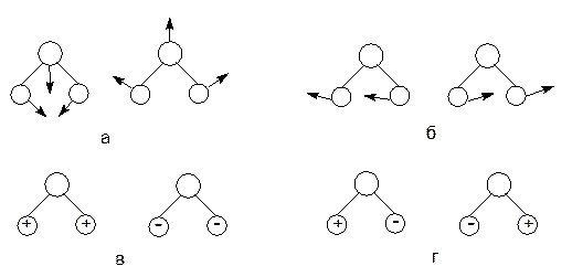 Рис. 3. Деформационные колебания в молекуле: а – ножничные; б – маятниковые; в – веерные; г – крутильные