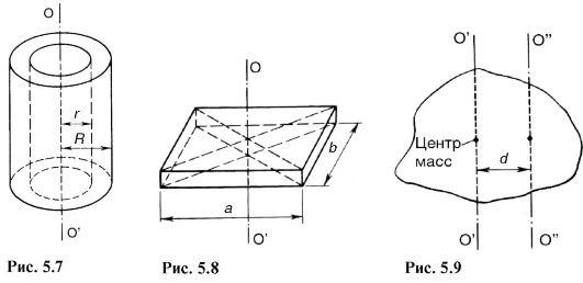 • полого однородного цилиндра (обруча) с внутренним радиусом r и внешним R относительно оси ОО', совпадающей с геометрической осью цилиндра (рис. 5.7):