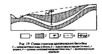 Нижележащие водоносные горизонты, заключенные между двумя водоупорными слоями, называются межпластовыми (рис. 18). В связи с неглубоким залеганием от поверхности уровень грунтовых вод испытывает значительные колебания по сезонам года: он то повышается после выпадения осадков или таяния снега, то понижается в засушливое время. В суровые зимы грунтовые воды могут промерзать. Эти воды в большей мере подвержены загрязнению. Различна глубина залегания грунтовых вод в разных природных районах. Она в первую очередь определяется климатическими условиями: в степных, полупустынных и пустынных ландшафтах грунтовые воды залегают значительно глубже, чем в лесных и тундровых ландшафтах. Большое влияние на глубину залегания грунтовых вод оказывает степень расчленения территории. Чем сильнее и глубже расчленение местности реками, балками и оврагами, тем глубже находятся грунтовые воды. Уровень межпластовых вод в отличие от грунтовых более постоянен, он меньше изменяется во времени. Межпластовые воды более чистые, чем грунтовые. Если межпластовые воды полностью заполняют водоносный горизонт и находятся под давлением, они называются напорными. Напором обладают все воды, заключенные в слоях, залегающих в вогнутых тектонических структурах. Вскрытые скважинами, эти воды поднимаются вверх и при достаточной высоте напора изливаются на поверхность или фонтанируют. Такие воды называются артезианскими (рис. 19). Подземные воды медленно перемещаются по уклону водоносного пласта. В речных долинах, балках, оврагах слои могут вскрываться (обычно это грунтовые воды), образуются естественные их выходы на земную поверхность — источники, или родники. Своеобразный тип источников — гейзеры, периодически выбрасывающие горячую воду и пар на высоту до 60 м. Они образуются в основном в областях современного вулканизма, где близко от поверхности залегает раскаленная магма. Гейзеры встречаются в США, России (на Камчатке), в Исландии, Новой Зеландии. Подземные воды различны по химическому составу и температуре. Верхние горизонты подземных вод обычно пресные (до 1 г/л) или слабоминерализованные. Глубокопогруженные горизонты нередко значительно минерализованы (до 35 г/л и более). По температуре они подразделяются на холодные (до +20°С) и термальные (от +20 до +100°С). Термальные вода обычно отличаются высоким содержанием различных солей, кислот, металлов, радиоактивных и редкоземельных элементов. Подземные воды имеют большое значение в природе и хозяйственной деятельности человека. Это важнейший источник питания рек и озер. При участии подземных вод формируются карстовые и оползневые формы рельефа, они снабжают растения влагой и растворенными в них веществами. При близком залегании от поверхности подземные воды могут вызвать процессы заболачивания. Они широко используются человеком для хозяйственно-бытовых, промышленных и сельскохозяйственных целей. Из термальных вод получают большое количество различных химических веществ (иод, глауберову соль, борную кислоту, различные металлы). Тепловая энергия подземных вод расходуется на обогрев зданий, теплиц, получение электроэнергии, наконец, подземные воды применяются для лечения целого ряда заболеваний человека.