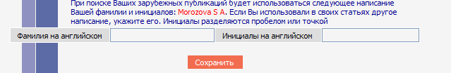 В последнем вопросе система предлагает вам идентифицировать также и англоязычное написание вашей фамилии и инициалов. Система покажет вам сгенерированный ею вариант, но также предлагаются и поля для заполнения, если вы с этим вариантом не согласны или уже использовали в статьях другое написание.