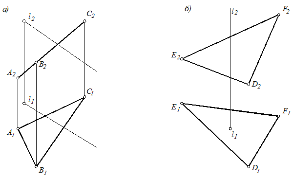 26. Построить проекции точки пересечения прямой l с плоскостями и определить видимость ее относительно плоскости.