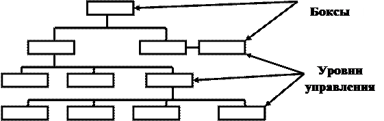 Организация как система может быть представлена в виде совокупности определенным образом взаимосвязанных подсистем (элементов), образующих единое целое. Состав, расположение и характер отношений между ними определяют структуру организации. Элементами структуры являются отдельные работники, функциональные подразделения, а также службы и другие звенья аппарата управления организацией. Отношения между ними осуществляются благодаря установлению устойчивых связей, которые принято подразделять на горизонтальные и вертикальные. Горизонтальные связи носят характер согласования и выражают отношения между равными по положению в иерархии компонентами организации, поэтому их относят к числу одноуровневых. Их главное назначение - способствовать наиболее эффективному взаимодействию частей организации при решении возникающих между ними проблем. Вертикальные связи - это связи подчинения, они соединяют иерархические уровни и служат каналами передачи распорядительной и отчетной информации. Устанавливаемые связи могут носить линейный или функциональный характер. Линейные связи отражают движение управленческих решений и информации между так называемыми руководителями, т.е. лицами, полностью отвечающими за деятельность организации или ее структурных подразделений. Функциональные связи, их часто называют штабными, имеют место по линии движения информации между отдельными частями организации и выполняют роль информационного обеспечения координации. В рамках структуры организации протекают различные процессы (управления, производства и др.), между участниками которых распределяются соответствующие задачи и функции, а, следовательно, и ответственность за их выполнение. С этих позиций структуру организации можно рассматривать как форму распределения различных видов деятельности между ее компонентами и координации деятельности этих компонентов, направленной на достижение целей организации. Одна и также структура не может в равной мере подходить для всех типов организаций, но каждое деловое предприятие (учреждение) обладает той или иной структурой, которая приспособлена к достижению ее конкретных целей. Структура позволяет работникам осознать свое место в организации и одновременно с этим обеспечивает координацию выполняемых ими функций. Основными характеристиками структуры организации являются разделение на отделы, подотчетность в соответствии с нормой управления и подчиненность, отражаемые на организационной схеме. Организационная схема, иногда называемая также органиграммной, показывает как устроена организация. Графически такая система может быть представлена путем начертания горизонтальных и вертикальных линий и боксов (рис. 10). Боксы определяют виды деятельности людей, которые их исполняют. Линии указывают на связи между ними. Число горизонтальных боксов указывает на то, сколько уровней имеет организация.