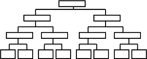 При формировании вертикальной структуры управления происходит группирование людей и работ в соответствии с оптимальным интервалом или масштабом управления. Масштаб (интервал) управления – это число людей или производственных единиц, за которыми наблюдает менеджер; называется также сферой контроля. Интервал управления часто характеризуют как «узкий» или «широкий». Узкий интервал управления характеризуется минимальным количеством подчиненных у одного руководителя и предлагает построение многоуровневой организационной структуры (рис. 14). Такое группирование людей и работ имеет и преимущества, и недостатки. Так, при меньшем количестве подчиненных руководителю легче осуществлять контроль за их работой и поэтому у него появляется возможность делать это более качественно и быстро. Однако при таком построении связей у руководителя может появиться стремление к вмешательству в их непосредственную работу. Кроме того, многоуровневость делает эти связи громоздкими, длинными и дорогими.