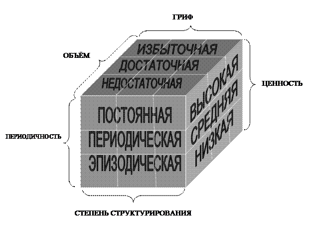 Современная информационная эра предъявляет специфические требования и к гражданам, и к организациям, и к государствам. Сегодня очевидно, что жить в информационном обществе, не меняя своей сущности, если и дано, то немногим. Большинству же людей предъявлены лишь две альтернативы: стать органичной частью этого нового общества и носителями его ценностей либо постепенно стать «второсортными» общественными элементами[80]. Закон информированности – упорядоченности (ЗИУ) гласит: «Каждая система (социальная или биологическая) стремится получить как можно больше достоверной, ценной и насыщенной информации о внутренней и внешней среде для устойчивого функционирования (самосохранения)». Другой вариант определения: «Любая социальная организация способна к выживанию в условиях обеспеченности полной оперативной достоверной (надёжной) и упорядоченной (структурированной) информацией»[81]. Каждая организация должна стремиться к созданию, поддержанию и развитию собственной информационной системы, основными функциями которой являются: сбор, обработка и классификация, предоставление и распространение, хранение и уничтожение (при необходимости). Кроме того, важной функцией информационной службы предприятия (организации) является развитие формальных и неформальных контактов с источниками информации (телевидение, радио, печать, Интернет, участие в выставках, презентациях и т.п.) с опорой на Интранет. Реализуя указанные функции, специалисты по информации концентрируют внимание на следующих её характеристиках: периодичность, объём и насыщенность, достоверность, ценность, гриф (см. таблицу 9). Таблица 9. Основные параметры современной информации